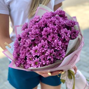 Букет из маттиол, пионовидных роз и хризантемы сантини